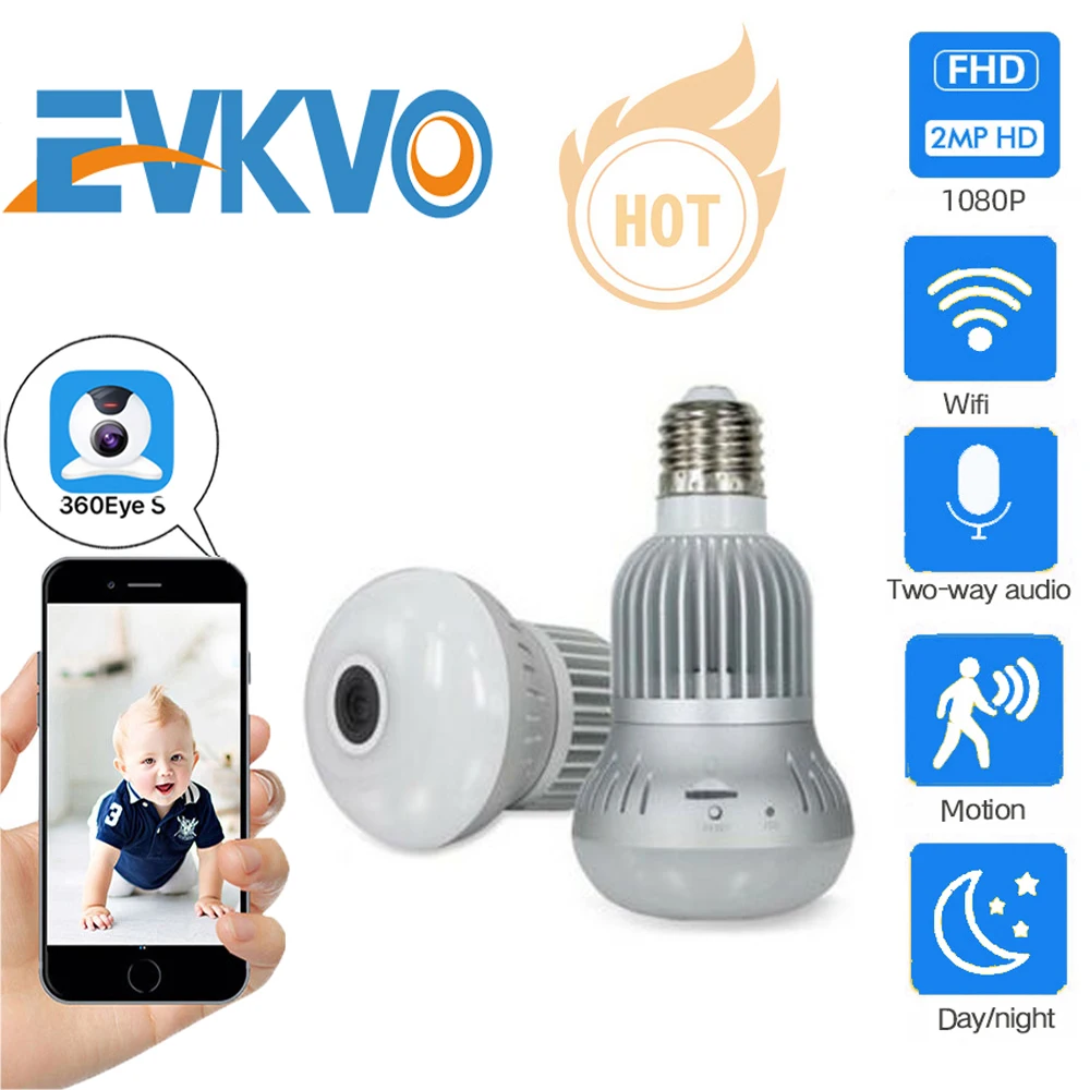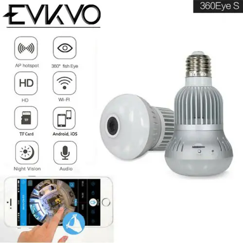BEST QUALITY EVKVO 360 Video Light IP Camera IR Night Vision Fisheye Panoramic Home CCTV Security Mini Wireless